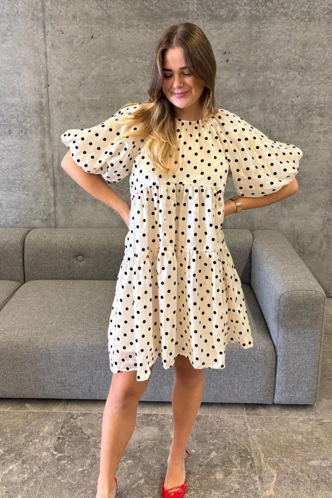 Beige klänning från Y. A.S med svarta prickar. Den har en lös passform med puffärmar och rund hals. Klänningen är knälång med volanger och bindband som skapar en lagerdesign.