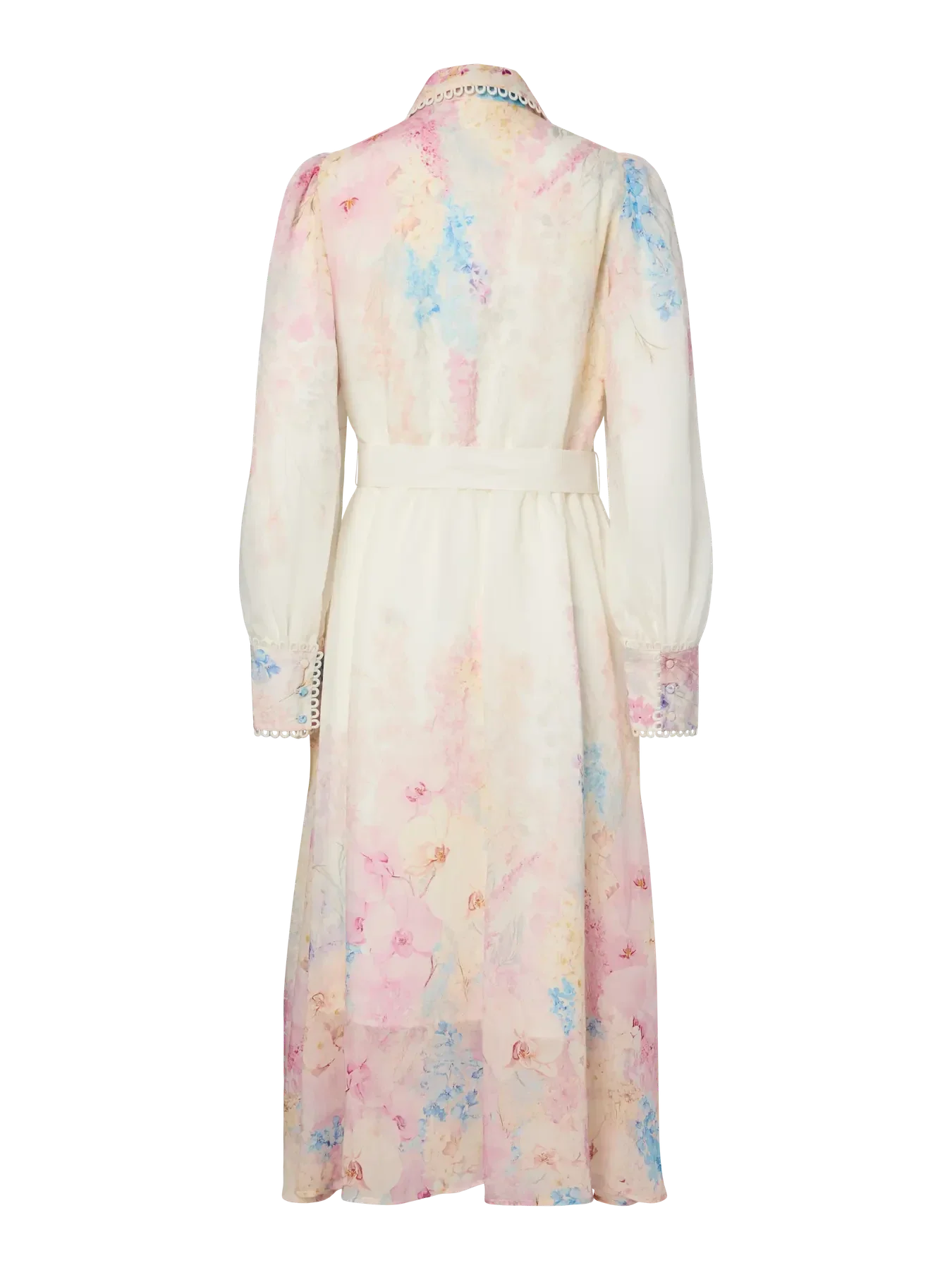 Lång klänning från YAS med blommigt tryck i pastellnyanser av rosa och blått på en cremevit bas. Klänningen har långa ärmar och ett bälte i midjan.
