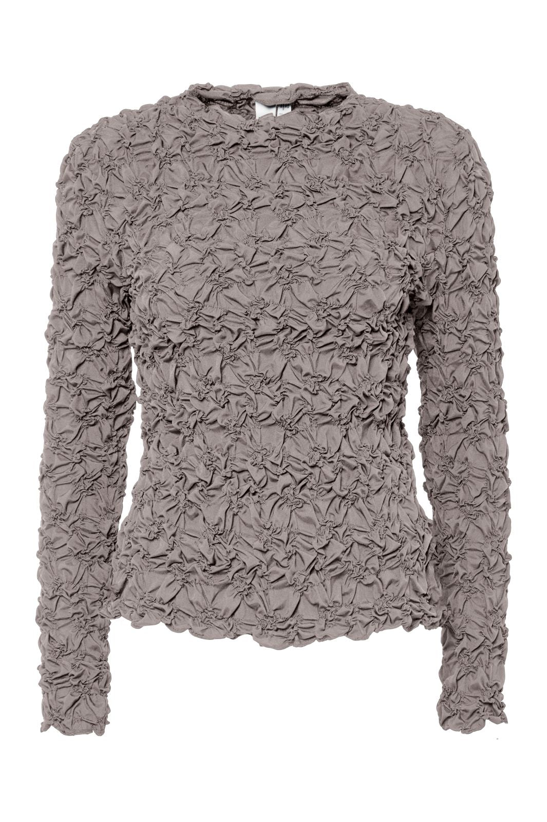 Langärmad topp från Y. A.S i gråbrun polyester. Toppen har en genomgående krinklad struktur, rund halsringning och en kroppsnära passform.