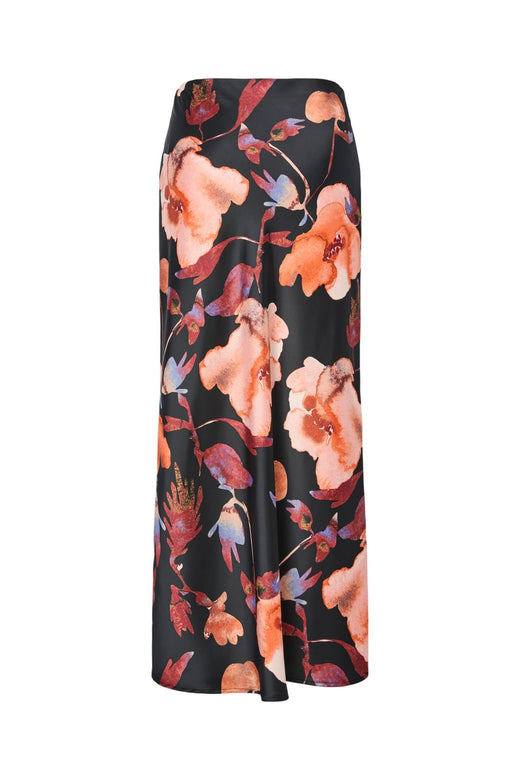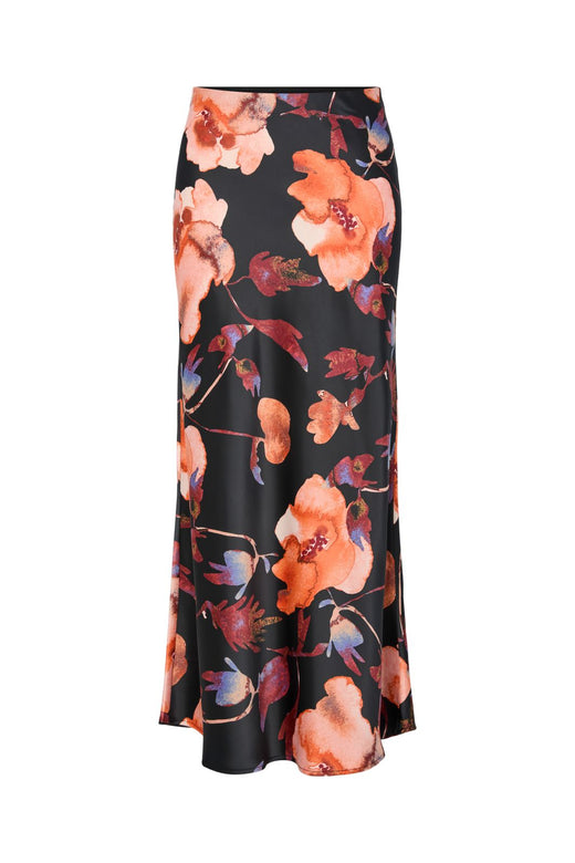 Svart maxikjol från Y.A.S med blommönster i orange, röd och blå nyanser på svart bakgrund. Kjolen har hög midja och går ner till golvet.