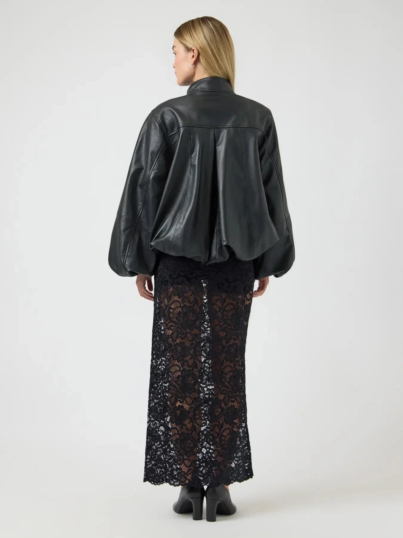 Svart skinnjacka från YAS, tillverkad av 100 % läder. Jackan har en hög krage och voluminösa ärmar med lätt rynkning vid muddarna.