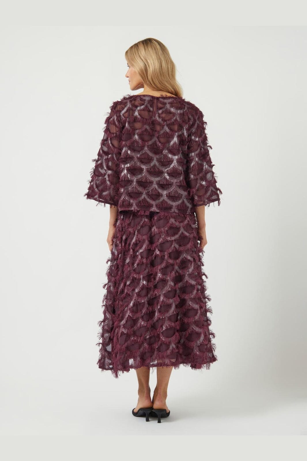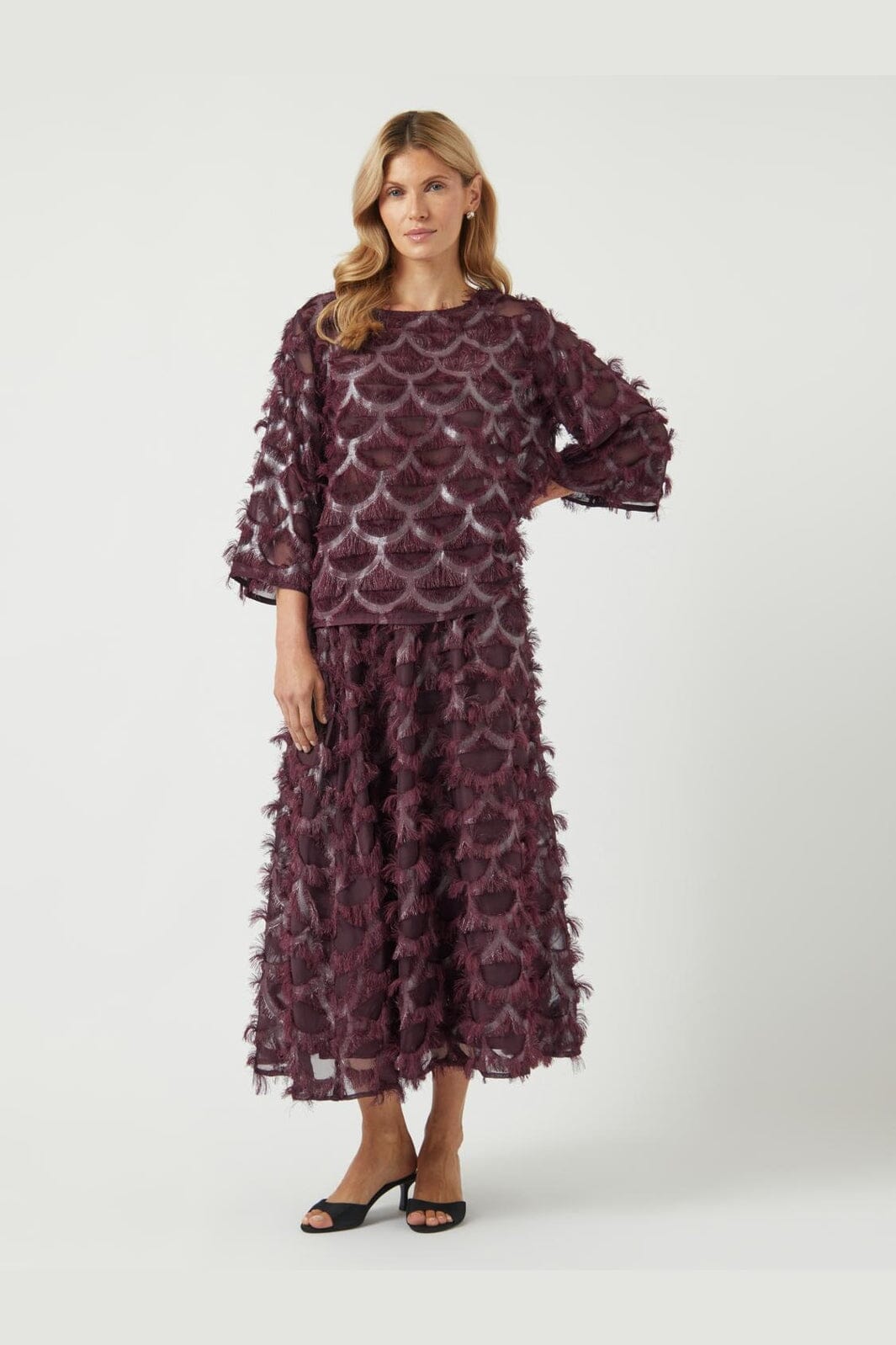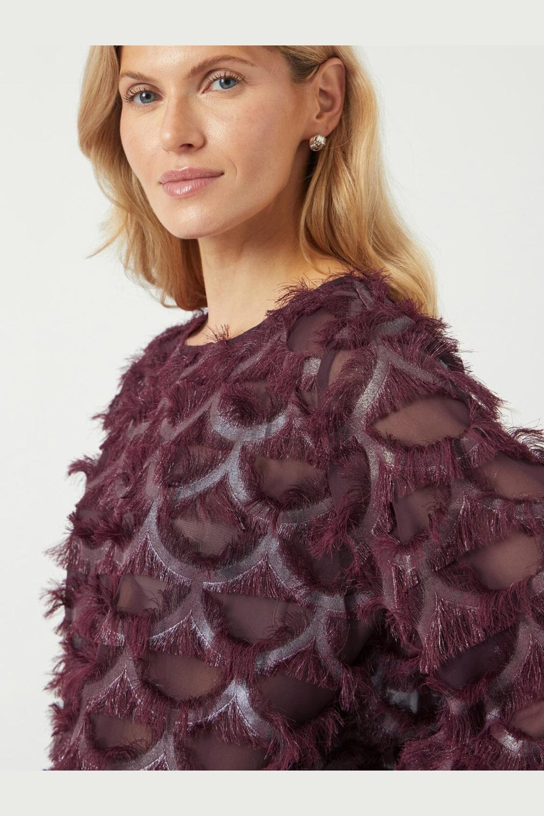 Top från YAS, tillverkad av 100 % polyester i en bordeauxröd nyans med metallisk glans. Toppen har ett mönster av halvcirklar med fransar.