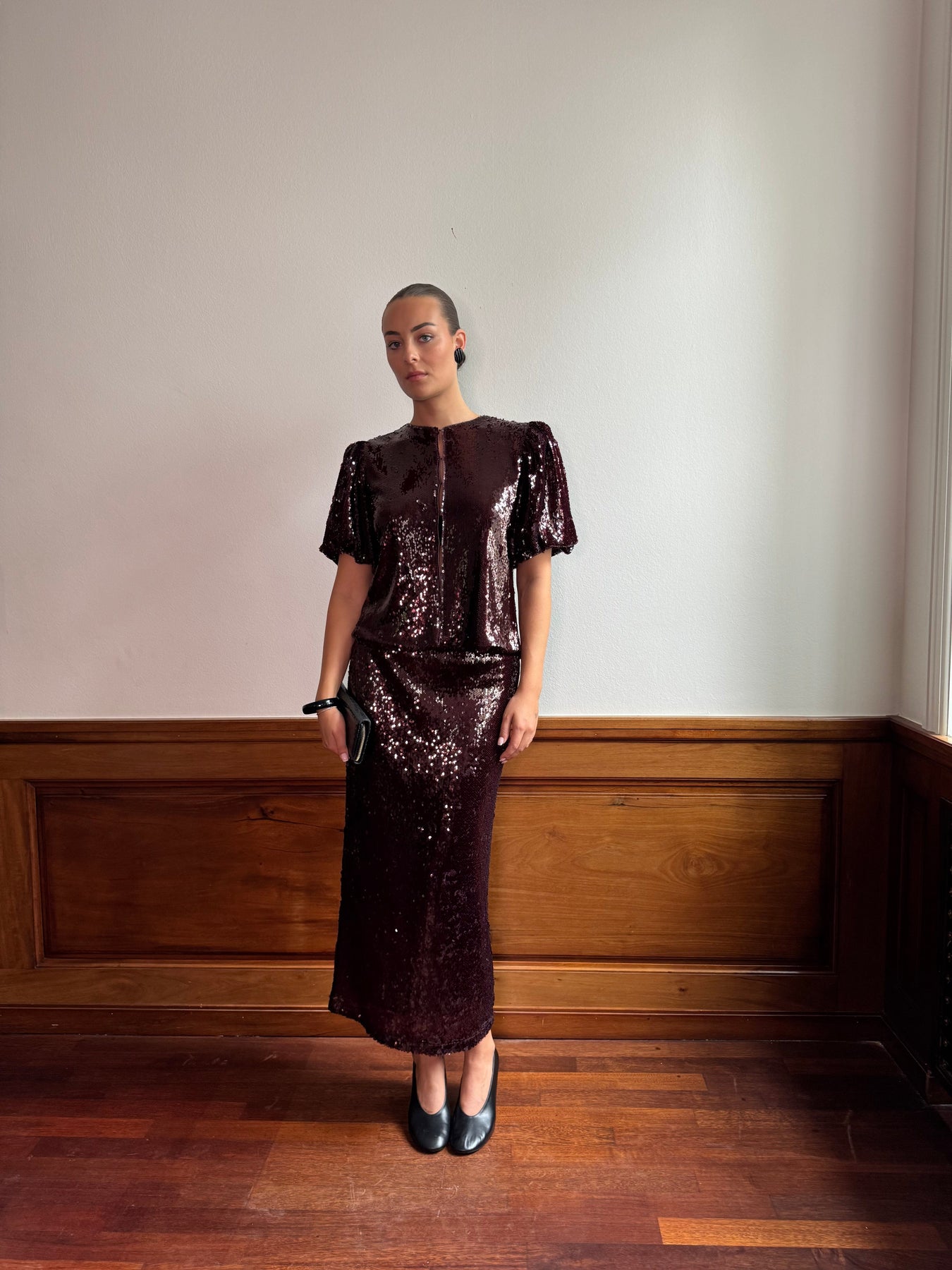 Ankellång kjol från YAS, täckt med paljetter i en djup burgundifärg. Kjolen är tillverkad av 100% polyester.