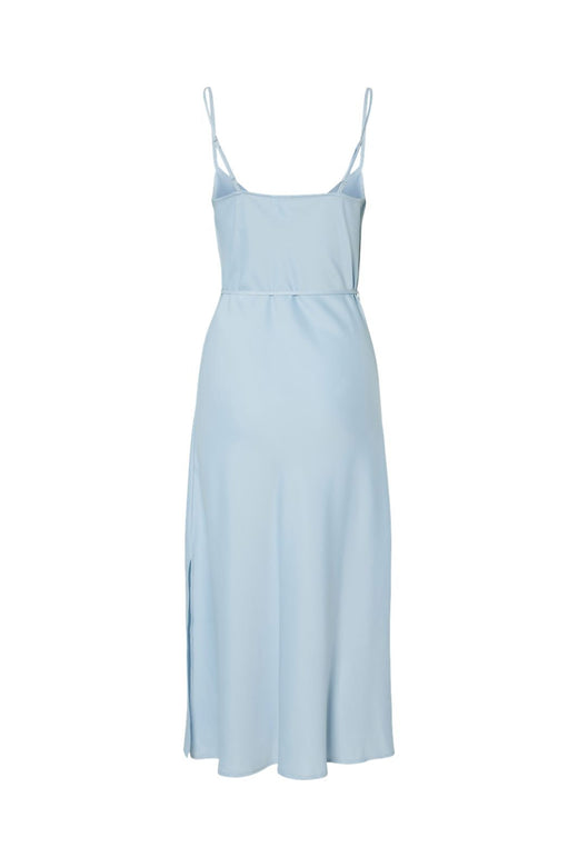 Lång ljusblå klänning från YAS med tunna axelband och knytdetaljer i midjan. Klänningen är gjord av återvunnen polyester.